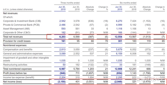 若按照业务划分,现阶段德银主要有三大板块,分别是:企业与投行业务(CIB)、私人和商业银行业务(PCB)、资产管理业务(AM)。其中CIB收入贡献比最大,但是从2019Q2看,CIB收入同比下滑18%,“负面贡献”也是最大。