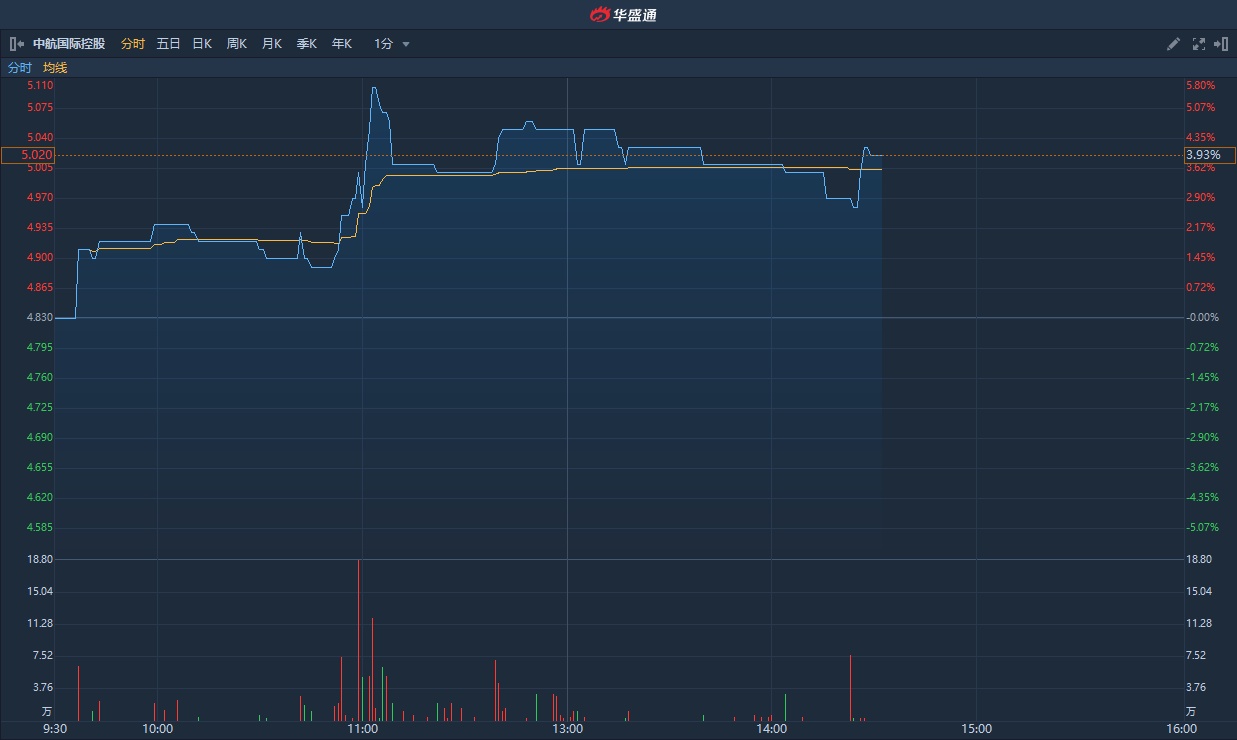 智通财经APP获悉,招商蛇口收购中航善达22.35%股权获国资委批复,截至14时30分,中航国际控股(00161)涨3.9%,报5.02港元,成交额716.55万港元。