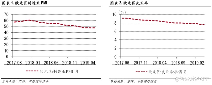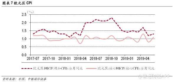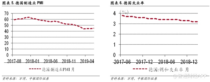 4.IMF将欧元区2019年和2020年增速预期分别上调0.1个百分点至1.3%和1.6%,IMF称是因为欧元区外部需求预计将回暖。与IMF相比,欧盟委员会在7月发布的《2019年夏季欧洲经济预测》则较为悲观,预期2019年欧盟和欧元区的经济增长率将分别仅为1.2%和1.4%,与2018年的1.9%和2%相差甚远。我们认为未来经济增速或较为悲观,因外部全球需求因素可能不如IMF预期的那样好。全球增长疲软且不稳定,长期存在的政策不确定性拖累了全球经济动态,因为贸易紧张局势依然严峻;英国在无协议的情况下退出欧盟的可能性也在增强。