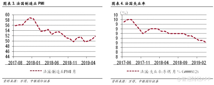 3.失业率表现较好,今年欧元区失业率均有所降低。整个欧元区的失业率从2018年5月的8.3%稳步下降至2019年5月的7.5%,平均每月保持平稳或0.1%幅度的下降,年度降幅达到9.6%,总体就业形势比去年趋好。其中法国失业率从2018年5月的9.1%缓慢下降到2019年5月的8.6%,其中2018年下半年保持在9.0%,整体就业情况趋于稳定,年度降幅5.5%,但形势依然严峻。法国劳工部长佩尼戈指出,本年度失业率下降和很多“不定期合同”的签订有关,其数量上升使得一些失业人口获得不定期的收入,暂时缓解了经济压力。佩尼戈还指出,黄衫运动是导致法国失业率居高不下的重要因素,对小商铺和中小企业冲击尤其巨大,但现在已逐渐消除影响。法国政府将重点放在学徒制和职业培训领域,斥资150亿欧元启动“职业技能投资计划”(PIC),这也对降低失业人数有一定帮助,但总体上没有改变法国经济增长放缓的大趋势。德国总体就业情况较为良好,调和失业率从2018年5月的3.4%下降至2019年5月的3.1%,年度降幅8.8%,整体就业情况好于欧元区平均水平。