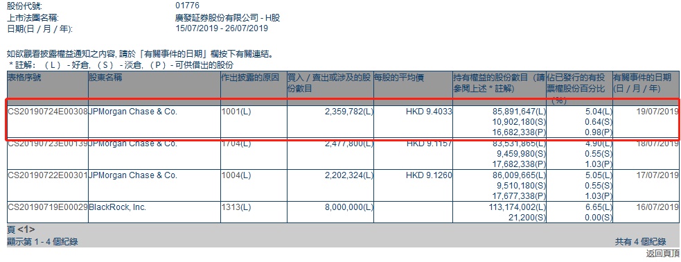 智通财经APP获悉,联交所最新资料显示,7月19日广发证券(01776)获摩根大通增持235.98万股,每股作价9.4033港元,总值约为2219万港元,最新持股数目约为8589万股,最新持股比例为5.04%。