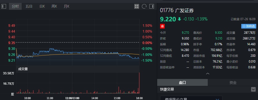 截至今日收盘,广发证券(01776)跌1.39%,报9.22港币。