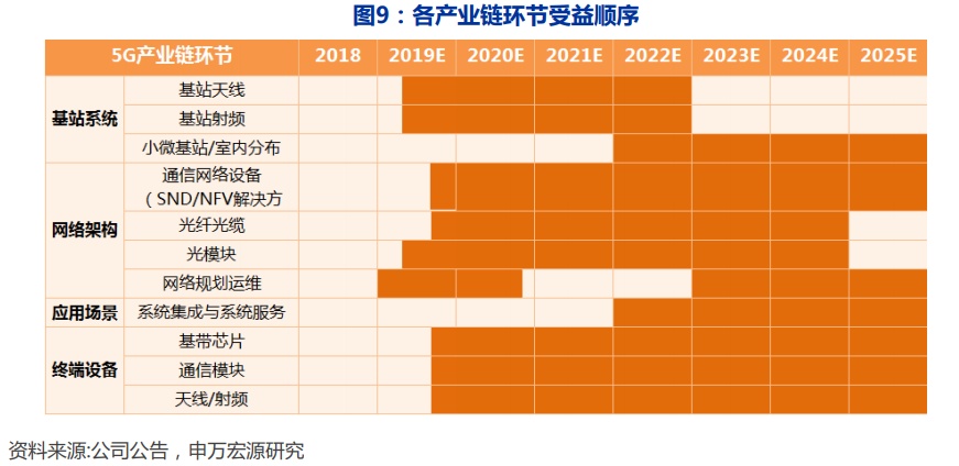 其实,5G天线及小基站领域在2019年业绩的增长也符合5G推进过程中产业链的受益时间点。据申万宏源资料显示,在5G推进的初期,最先受益的环节是网络规划运营和维护,其次便是基站天线、基站射频和光模块,之后才是通信网络设备、终端设备和光纤光缆。