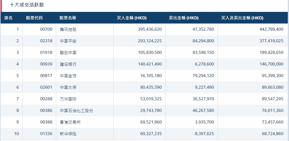 港股通(沪)十大活跃成交股