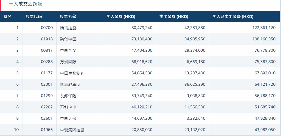 港股通(深)十大活跃成交股