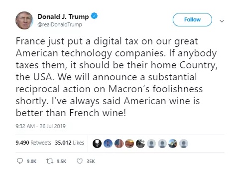 推特意思:法国正要对我们伟大的美国科技公司征收数字税。假如有人要对他们征税,那应该是由他们的母国——美国来做。很快,我们就会对马克龙的愚蠢采取实质性的回报行动。我向来都说,美国葡萄酒要比法国葡萄酒好喝。