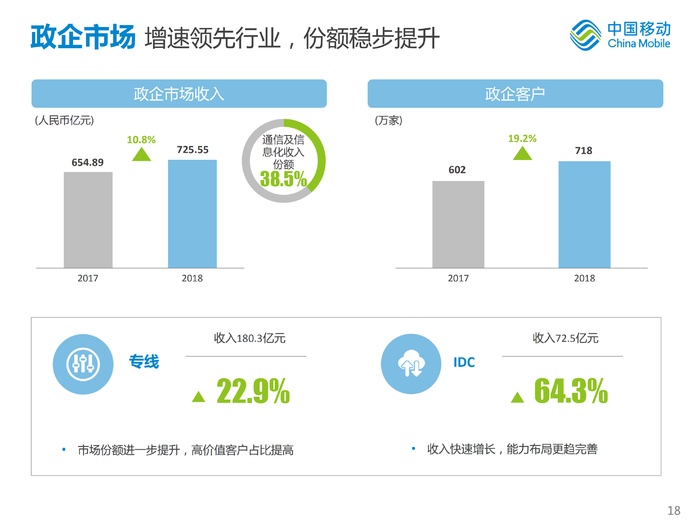时至今日,中国移动2018年全年收入超过8400亿元人民币,其中政企客户总数达到718万家,客户数同比增长19.2%,该业务全年业务收入725.55亿元,同比增长10.8%。具体业务方面,集团语音、短彩信全年收入260.30亿元,专线、IDC去年全年收入252.86亿元。