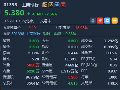 智通财经APP获悉,工行(01398)及信达(01359)入股,停牌近四个月的锦州银行(00416)约17%股权,早盘股价均受挫。截至10时36分,工商银行跌2.54%,报价5.38港元。