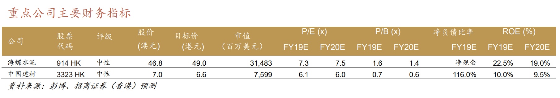 目前水泥价格高企,错峰生产等去产量手段对价格的提振作用变小,更多的是表现为帮助稳定价格。从上半年情况来看,在基建需求复苏、房地产需求稳健的区域(如京津冀和长三角)占优的企业将更具盈利稳定性,其中华北地区由于去年的低基数,表现出更大的弹性;而华东地区需求稳定在高位,稳定性更强。目前行业估值在1.1倍2019年前瞻市净率,高于历史均值11%,我们认为已反映上半年房地产投资超预期带来的水泥需求超预期,维持行业中性评级。