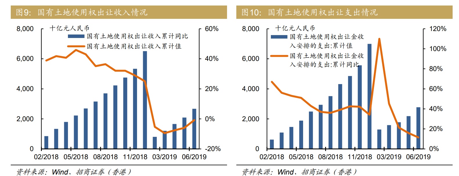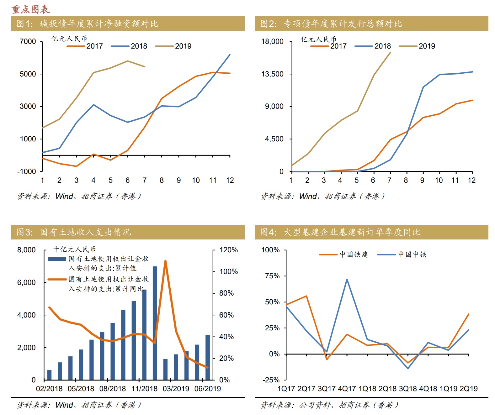 截止7月24日,专项债的发行进展顺利,6月和7月专项债发行总额分别为4,978/3,138亿元人民币,相比2019年平均月度发行总额2,359亿元人民币大幅提高。但若按2019年总规模2.15万亿元人民币计算,2019年剩余时间的发行规模约在5,000亿元人民币左右,而2018年同期发行规模约为1.2万亿元人民币,所以下半年的同比发行规模将明显承压。城投债方面,5-7月的发行净额均不大,但由于1-4月的发行规模较大,截止7月城投债累计发行规模同比增长超130%。但城投债面对与专项债同样的问题,即今年债务发行的节奏均靠前,下半年的空间有限。作为基建另一主要资金来源的土地出让收入同比年初以来持续改善,降幅从前3个月累计同比9.5%收窄至前6个月累计同比0.8%。土地收入有所回升,但由于目前政府收紧了房地产信托,下半年的表现仍待观察。不同于土地收入,土地出让金支出一直保持正增长。综合上述三点,我们最大的担忧是上半年专项债、城投债和土地出让金支出方面净增加了1.25万亿元人民币的情况下,基建数据并没有明显改善。下半年上述数据均可能回落,基建数据的表现或令人担忧。资金面及实际基建数据表现背离的原因尚不明确,我们认为可能有资金到位节奏上的原因,也有社会资金和非标资金参与度低的问题,后续的演化仍待观察。