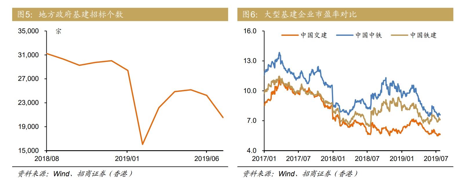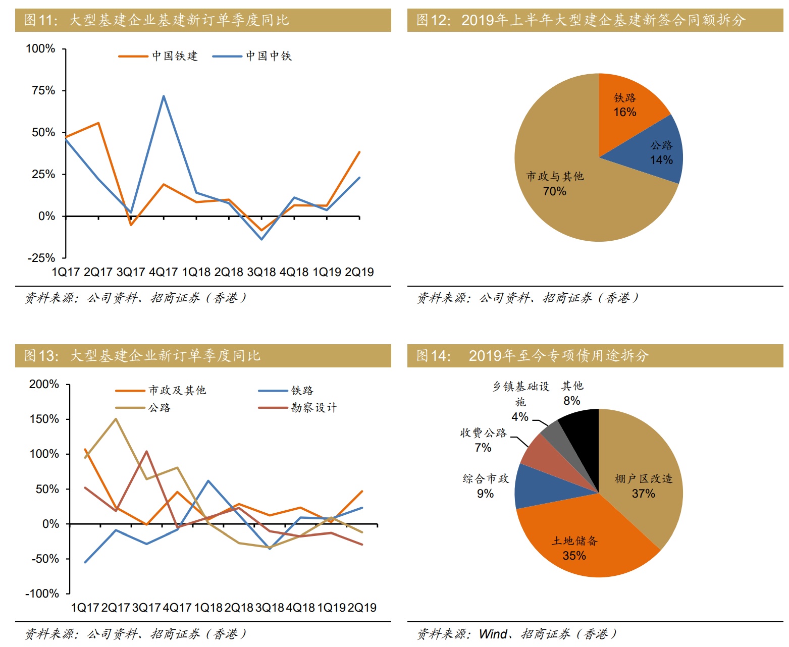 2019年二季度,大型建筑企业的新订单情况持续回暖,中国中铁(390HK)和中国铁建(1186HK)二季度基建新订单分别同比提升23.1%和38.5%,增速较一季度分别提升32.2和19.4个百分点。行业平均来看,市政工程二季度新订单同比增长46.8%,同比增速提升43.9个百分点;铁路新订单同比增速为23.1%,同比增速较一季度增长15.3百分点;公路新订单同比下降12.0%,同比较一季度减速21.3个百分点。专项债的数据同样显示,棚户区改造、土地储备与市政工程占专项债总规模的81%。但潜在的不利因素是勘察设计板块的新订单同比下降29.4%,较一季度降幅扩大16.7个百分点。根据全国公共资源交易平台的数据,5月以来全国工程建设招标宗数下降。同时我们认为大型建筑企业的订单覆盖倍数逐年增加,新订单总量虽然实现两位数增长,但能否带动收入超预期增长仍需要观察。