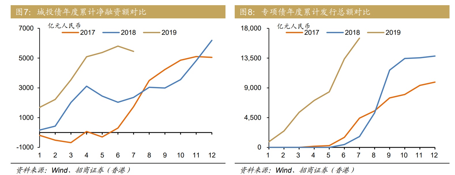2019年上半年城投债和专项债的发行情况均较2018年明显提前,2018年两者发力基本都是在6月份前后。而由于2018年下半年政府对突变的国际形势已经有了充分认识,所以2019年的债务发行情况较2018年有明显提前。专项债发行规模预计为2.15万亿人民币,城投债预计发行净额与2018年持平,我们认为两者下半年的发行空间均明显低于2018年同期水平。