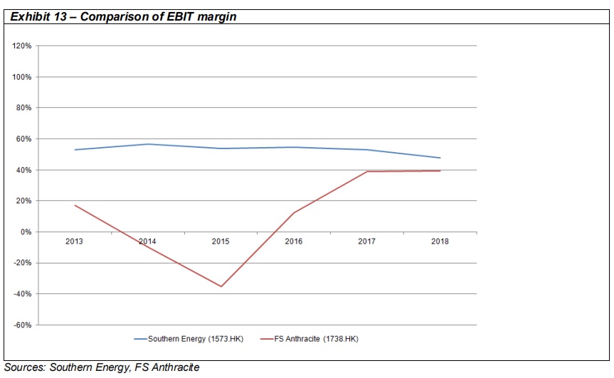 从图13中可明显看出,南方能源的息税前利润(EBIT)一直高于FS无烟煤。其中,在2014年和2015年,因煤炭价格大幅下跌,FS无烟煤遭受息税前损失。令人惊讶的是,南方能源声称未受到油价下跌的影响。2016年和2017年,FS无烟煤的EBIT利润率在煤炭价格反弹的推动下有所回升,但南方能源继续报告利润率稳定。