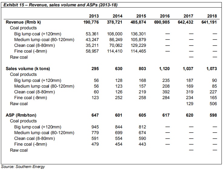 表15显示了南方能源的收入,销售量和ASP(以煤大小分类)