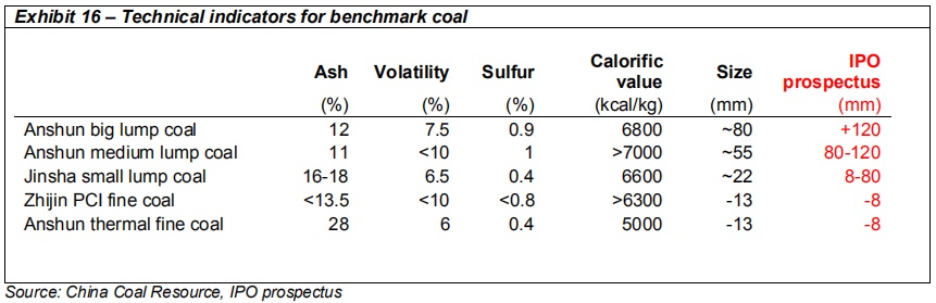 下表16为中国煤炭资源五种基准煤的技术指标。安顺大块煤灰占12%;波动率7.5%;硫0.9%;热值6800kcal/kg,尺寸最大为80mm。另一家提供煤炭行业数据的网站——中国煤炭市场(China coal Market)获得的五种基准煤的技术指标,与中国煤炭资源(China coal Resource)的数据几乎完全相同。