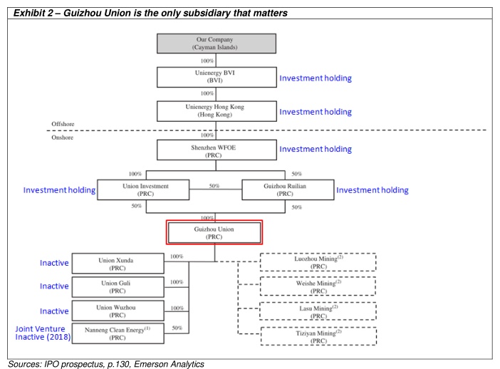 下面的图表2摘自其IPO招股说明书,披露了南方能源在上市时的公司结构,从那以后就并未变化。由此可见,贵州优能(集团)矿业股份有限公司为其唯一重要的子公司。
