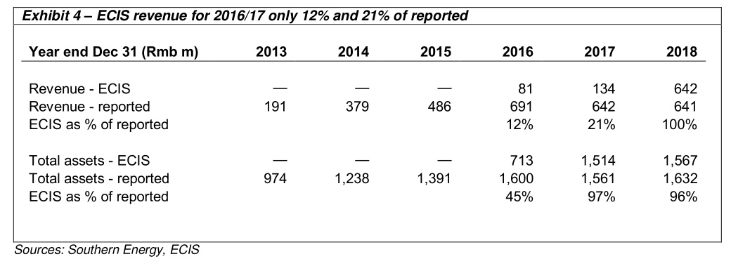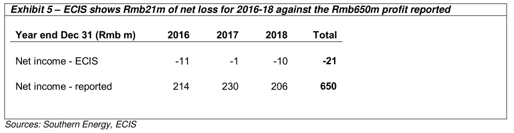 收入被夸大了5倍,利润被严重夸大也是很自然的。我们在第1.3节中表明,ECIS数据显示,2016-18年净亏损为2100万元人民币,而不是南方能源声称的6.5亿元人民币的利润。