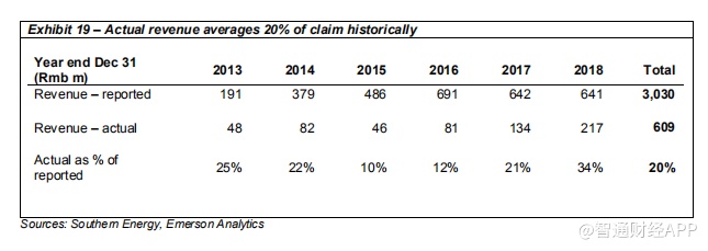 下面的图表19显示了2013-18年间南方能源公司的实际和报告收入。总的来说,该公司称在六年期间的收入为30.3亿元人民币,但我们估计该公司仅实现了6.09亿元人民币的销售额,仅占其报告金额的20%。