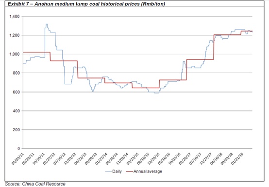 表7为安顺中块煤历史价格,数据来源于中国煤炭资源网 (http://www.sxcoal.com/)。网站由山西汾渭能源咨询有限公司运营——南部能源行业IPO申请顾问。煤炭价格目前处于10年高点,罗州煤矿为何要停产?有关煤炭价格的更多讨论,请参阅“第四部分煤炭价格异常高”。
