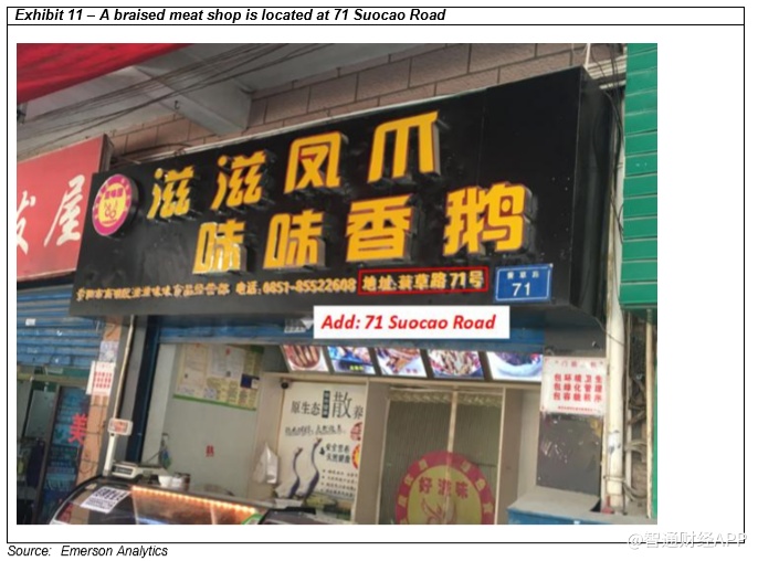 - 我们未能在这两家公司分别的注册地址处找到他们。贵州瑞金航的注册地址在贵阳市南明区蓑草路71号,但我们找到的是一家熟食店,如下图Exhibit 11所示。贵州金坤的注册地址是贵阳市南明区富源南路340栋10号。我们的调查人员在富源南路找了一天也没有找到这个地方。