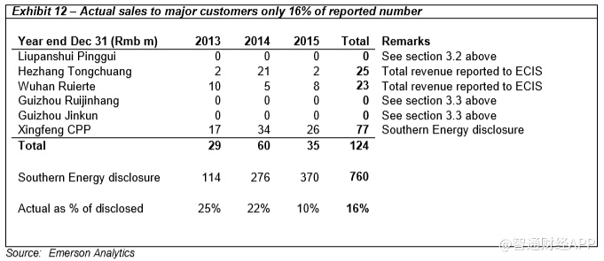 我们在下面的图表12中总结了南方能源对六个主要客户的实际销售情况。如前所述,在2013-15年兼,南方能源实际上并没有向六盘水苹贵、贵州瑞金航、以及贵州金坤进行销售。据ECIS,对于赫章县同创以及武汉瑞尔特而言,南方能源的销售额不可能会超过他们各自的营收。对于杏丰洗煤厂,在没有任何伪造的具体证据情况下,我们仅采用了南方能源披露的数据。