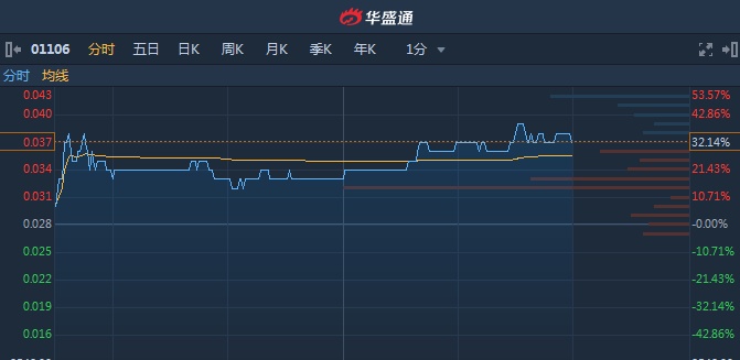 智通财经APP获悉,细价股铭霖控股(01106)放量上涨,暂居涨幅榜首位。截至14时58分,涨32.14%,报价0.037港元,成交额1752万。