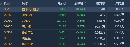 智通财经APP获悉,珠宝板块今日表现弱势,截至发稿,周大福(01929)跌5.6%,六福集团(00590)跌5.59%,周生生(00116)跌3.28%。