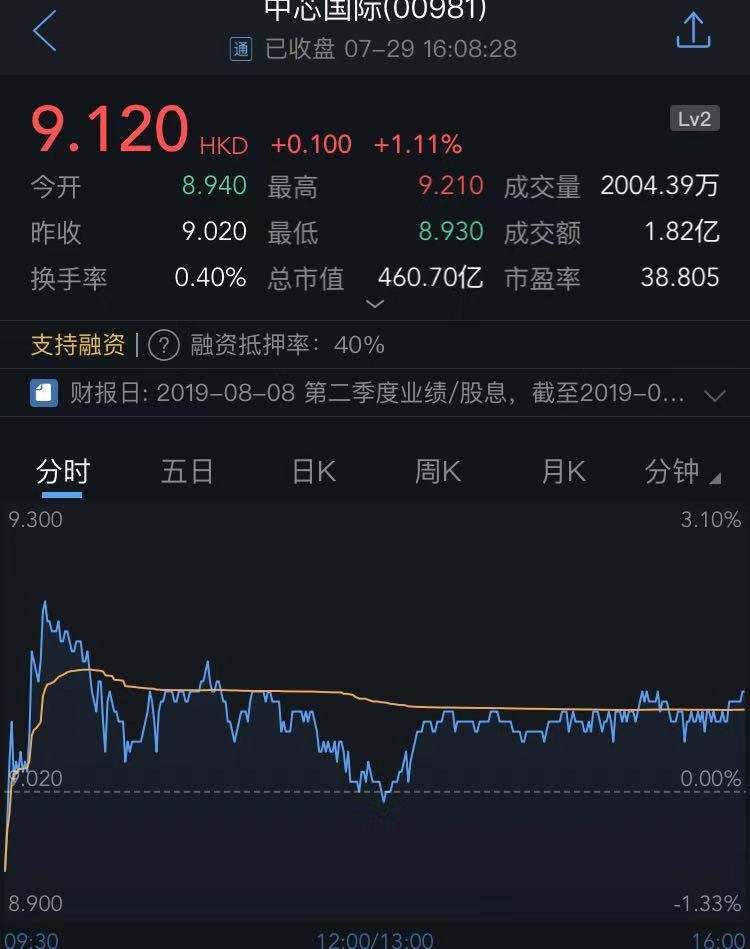 截至今日收盘,中芯国际涨1.11%,报9.12港元。