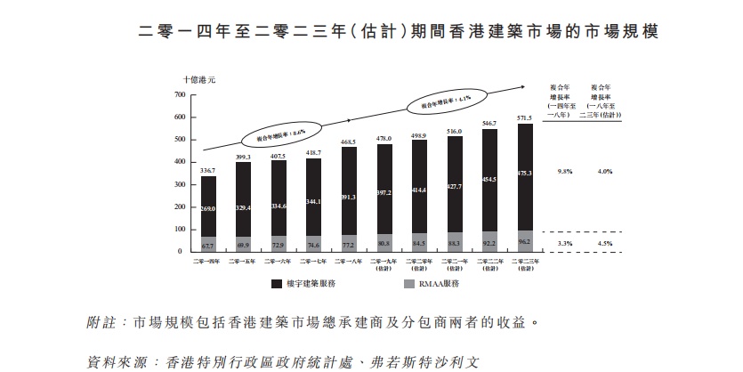 香港的建筑市场规模由2014年的3,367亿港元按复合年增长率8.6%增加至2018年的4,685亿港元。于2018年,RMAA服务市场与楼宇建筑服务市场分别占总建筑市场规模的16.5%及83.5%。建筑市场规模预期于2018年至2023年间按复合年增长率4.1%增加至2023年的5,715亿港元。