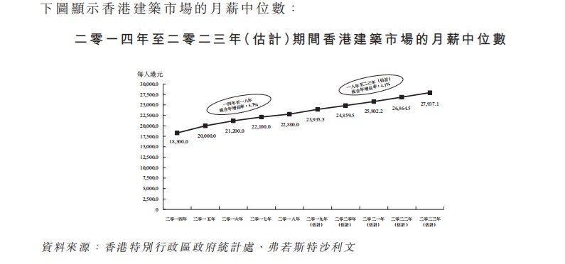 香港劳工于建筑市场的月薪中位数由2014年的18,300港元增加至2018年的22,800港元。于2018年至2023年间,香港劳工于建筑市场的月薪中位数估计保持稳定增幅。香港劳工于建筑市场的月薪中位数预期于2023年达27,937.1港元。香港建造业的薪资持续增加乃主要由于劳工短缺,导致香港相关建筑公司的劳工成本增加。劳工短缺及劳工成本增加将成为香港建筑公司的主要挑战。