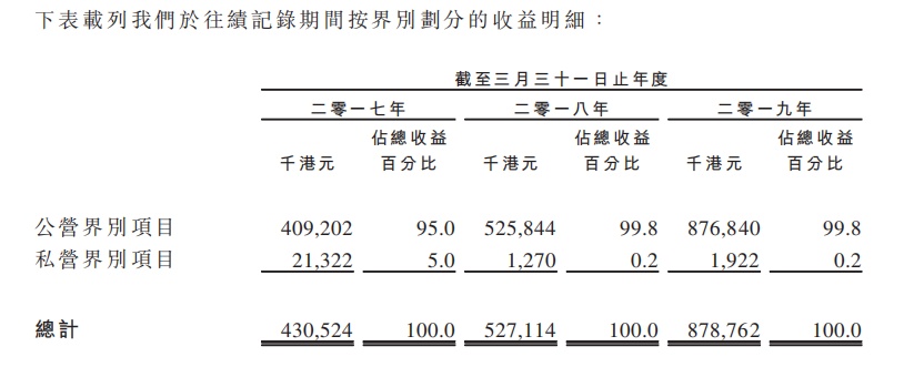 德益控股的客户大部分均为香港建筑项目的总承建商。其中最大客户应占的德益控股总收益百分比分别约为54.9%、41.0%及42.5%,而五大客户应占的德益总收益百分比则分别约为93.0%、97.0%及98.6%。德益控股所有的收益均来自于香港提供的服务,其中来自公营界别项目的收益约为409.2百万港元、525.8百万港元及876.8百万港元,分别占德益控股的总收益约95.0%、99.8%及99.8%。