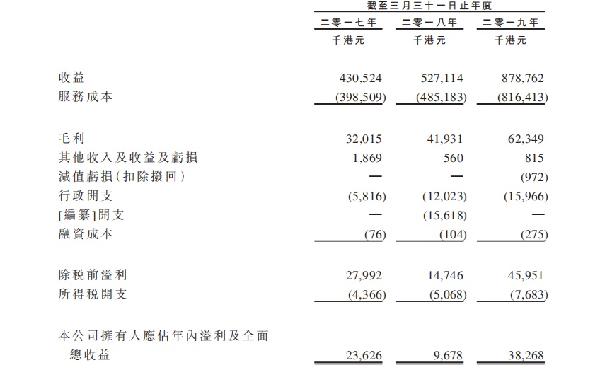 截至2017年、2018年及2019年3月31日止年度,德益控股的收益分别约为430.5百万港元、527.1百万港元及878.8百万港元;毛利分别约为32.0百万港元、41.9百万港元及62.3百万港元;毛利率分别约为7.4%、8.0%及7.1%;及德益控股的年度溢利及全面收益总额分别约为23.6百万港元、9.7百万港元及38.3百万港元。
