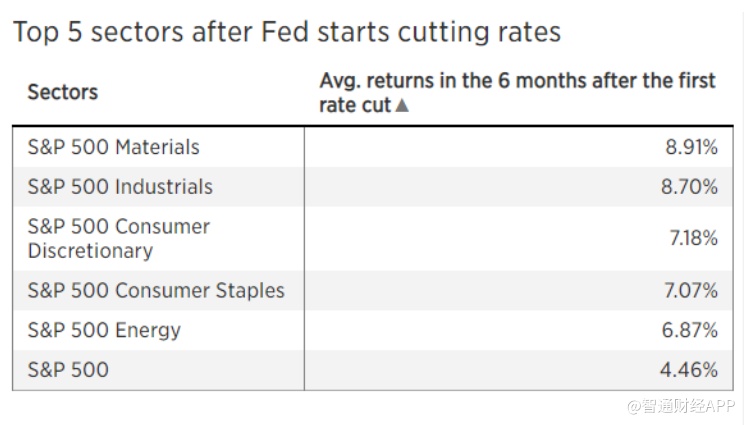 分析师使用对冲基金分析工具Kensho分析发现,自1990年以来,在美联储降息后的6个月内,美股表现最好的板块是材料和工业,这两个板块的涨幅几乎达9%,因为周期性行业往往会对较低的利率和对经济震荡的预期做出快速反应。