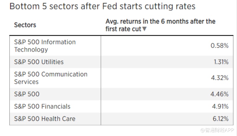在降息后的6个月内,美股整体平均上涨了4%多一点。一些板块表现较差,分析师指出,科技板块是投资者应避免进入的一个板块,非周期性公用事业也并未从过去的降息中获得太大提升。通信服务,医疗保健和金融业也是表现较差的板块。