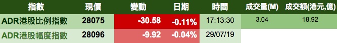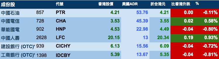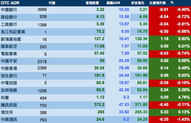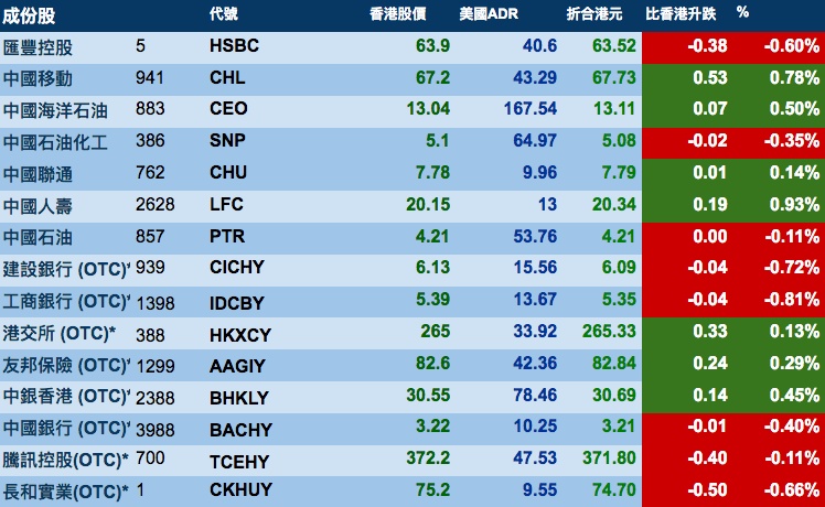 智通财经APP获悉,美股涨跌互现,港股ADR指数全日偏弱,按比例计算,收报28075点,跌30.58点或0.11%。大型蓝筹股个别发展,汇丰控股收报63.52元,较港收市跌0.38元;腾讯控股收报371.8元,较港收市跌0.4元。