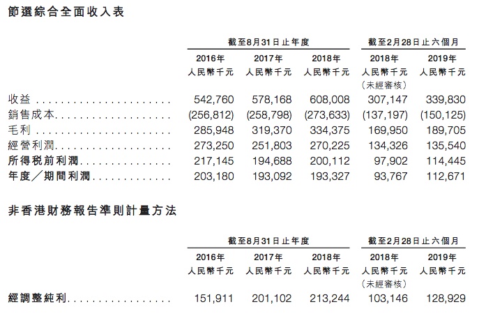 营业记录期间,该公司收益由截至2016财年的5.42亿元人民币(单位下同)微升至2017财年5.78亿元, 2018财年大增至6.08亿元。截至2019财年2月28日止6个月收益为3.39亿元。