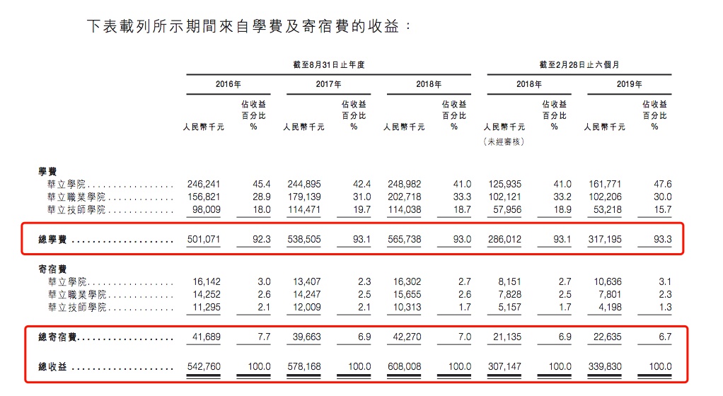 学校收益主要来自于学费以及寄宿费,三所学校中,华立学院学费收入占比最大。以2019财年6个月收益为例,华立学院、华立职业学院以及华立技师学院的学费占比分别为47.6%、30%及15.7,寄宿费方面占比分别为3.1%、2.3%及1.3%。