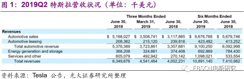 2019Q2单季度,特斯拉实现营业收入63.5亿美元,环比增长39.8%,同比增长58.7%;其中,汽车业务收入53.8亿美元,环比增长44.4%,同比增长60.1%。2019年上半年,特斯拉营业收入累计108.9亿美元,同比增长47.0%;其中,汽车业务收入91.0亿美元,同比增长49.4%。