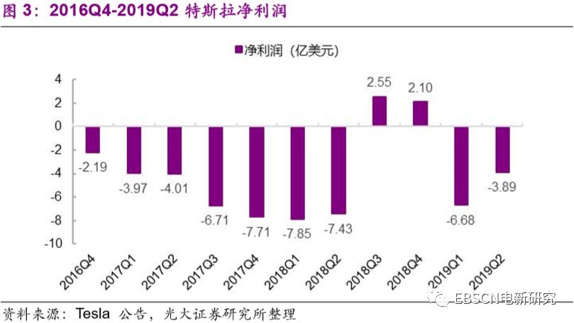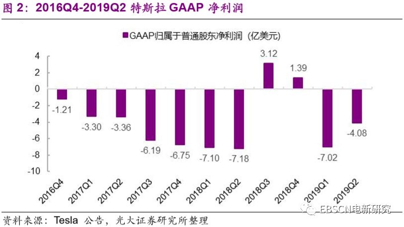 2019Q2单季度,特斯拉实现营业收入63.5亿美元,环比+39.8%,同比+58.7%;其中,汽车业务收入53.8亿美元,环比+44.4%,同比+60.1%。2019年上半年,特斯拉营业收入累计108.9亿美元,同比+47.0%;其中,汽车业务收入91.0亿美元,同比+49.4%。与上一季度相比,2019Q2公司净亏损收窄至3.89亿美元,GAAP净亏损收窄至4.08亿美元,仍未实现盈利。