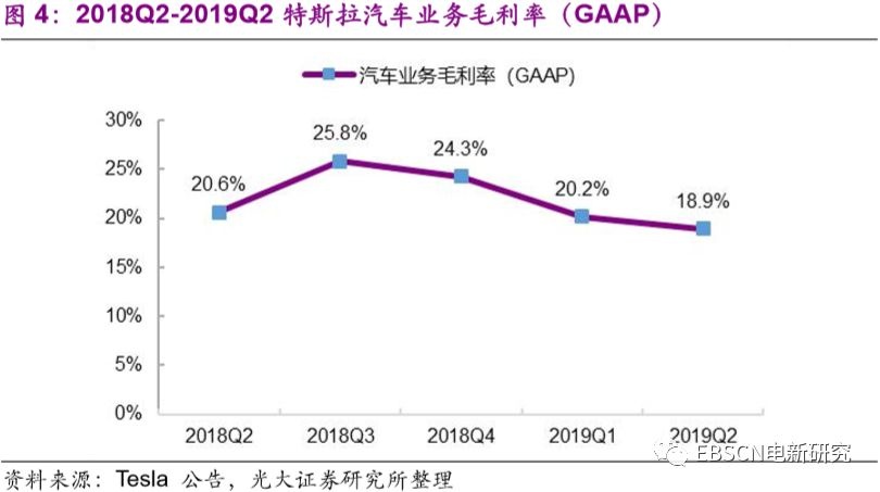 2019Q2,特斯拉汽车业务整体毛利率(GAAP)为18.9%,环比2019Q1下降1.3pcts。Q2监管信誉积分收入(regulatory credit revenue)有所减少,剔除该收入的影响后,尽管高价Model S/X降价去库存而且Model 3平均售价下降,但Q2汽车业务毛利率相较Q1仍然提高了2pcts,主要是因为成本管控工作取得了很好的成绩。