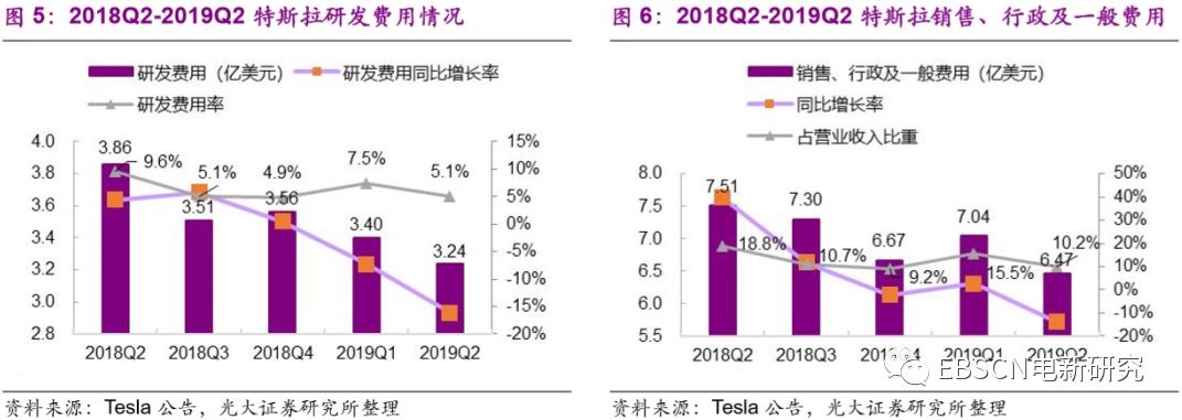 费用方面,2019Q2,特斯拉研发费用为3.24亿美元,同比减少16.1%,Q2研发费用为近四个季度以来新低,研发费用率为5.1%,不管同比还是环比均下降明显;销售、管理及一般费用(Selling, general and administrative)为6.47亿美元,同比减少13.8%,费用率为10.2%,相比去年同期及Q1,分别下降8.6/5.3pcts。总体来看,特斯拉的费用率下降明显,一方面是公司收入大幅增长所致,同时各项费用的绝对值环比也有所减少。