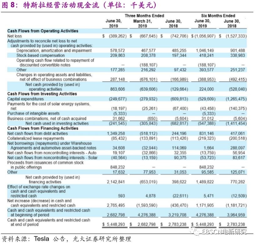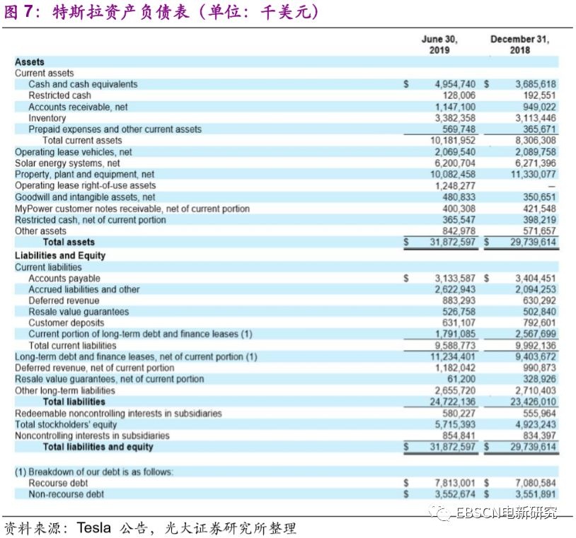 截至2019Q2末,特斯拉现金和现金等价物为49.55亿美元,较年初的36.86亿美元增长了34.4%;应收账款为11.47亿美元,较年初的9.49亿美元增长了20.9%;固定资产为100.82亿美元,比年初的113.30亿美元减少了11.0%;租赁车辆资产为20.70亿美元,比年初的20.90亿美元有小幅减少。