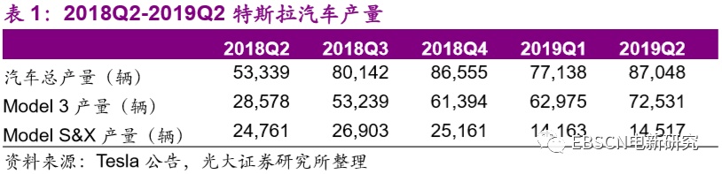 产量方面,2019Q2,特斯拉共生产汽车87,048辆,环比增长12.8%,超越2018Q4创历史新高。其中,Model