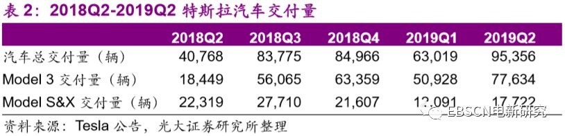 产量方面,2019Q2,特斯拉共生产汽车87,048辆,环比+12.8%,超越2018Q4创历史新高。其中,Model 3产量72,531辆,环比+15.2%,Model S&X产量合计14,517辆,环比+2.5%。2019上半年,特斯拉合计生产汽车超16.4万辆,其中Model 3产量超13.5万辆,Model S&X产量近3万辆。按照每月4周计算,2019Q2 Model 3平均周产量达到6,044辆,且产量逐月提升。目前,美国加州弗里蒙特工厂Model 3周产能可达7,000辆,目标2019年底实现各型号汽车周产量10,000辆。交付方面,2019Q2,特斯拉共交付汽车95,356辆,环比+51.3%,继2018Q4后再创历史新高。其中,Model 3交付量为77,634辆,环比+52.4%,Model S&X交付量合计17,722辆,环比+46.6%。