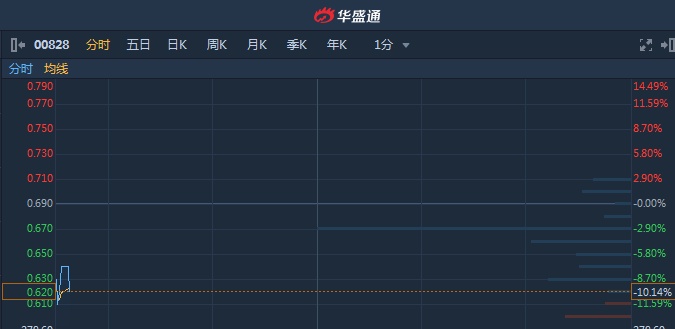 智通财经APP获悉,王朝酒业(00828)停牌超6年,昨日复牌收跌52.08%,今日早盘跌势延续,一度低见0.57港元破底。截至9时37分,跌10.14%,报价0.62港元,成交额396.8万。