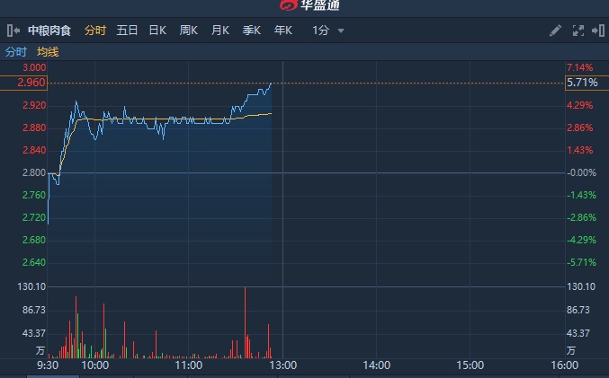 智通财经APP获悉, 德弘资本今日宣布完成对中粮肉食控股有限公司的股权投资。截至发稿,涨5%,报2.94港元,成交额4585.95万港元。