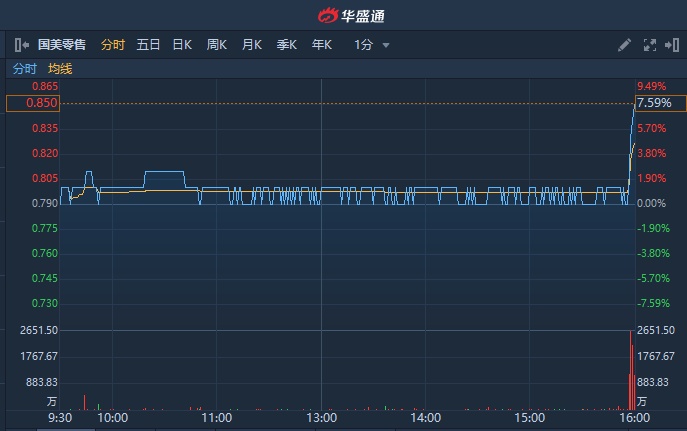 港股异动 | 国美零售(00493)尾盘资金快速流入 直线拉涨7.59%