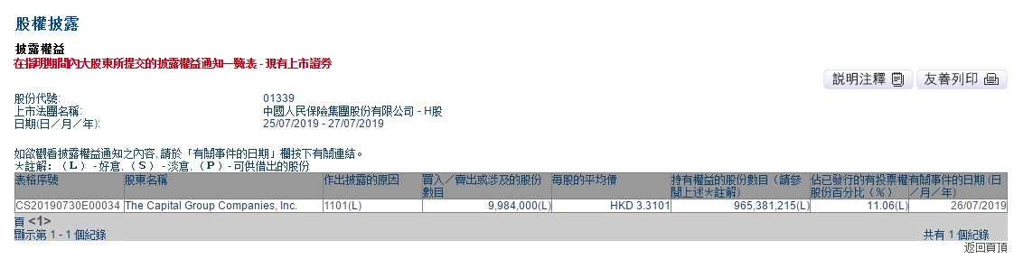 智通财经APP获悉,联交所最新资料显示,7月26日中国人民保险集团(01339)获The CapitalGroup增持998万股,每股作价3.3101港元,总值约为3303万港元,最新持股数目约为9.7亿股,最新持股比例为11.06%。