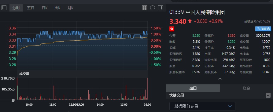 截至今日,中国人民保险集团(01339)涨0.91%,报3.34港币。