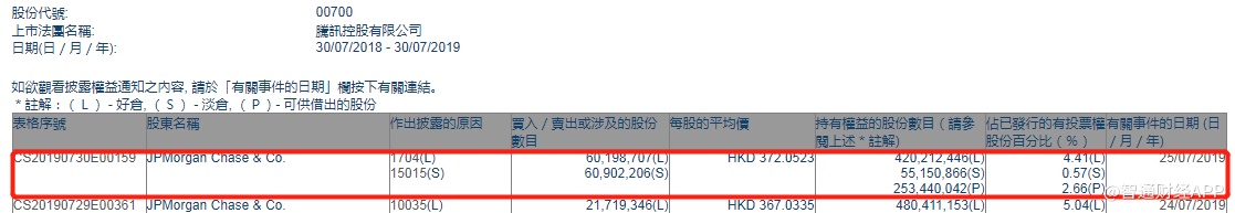 智通财经APP获悉,联交所最新资料显示,7月25日,摩根大通减持腾讯(00700)6020万股,每股作价372.052港元,总值约为224亿港元,最新持股数目约为4.20亿股,最新持股比例为4.41%。